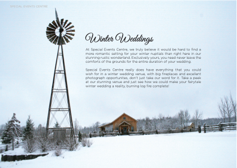 At Special Events Centre, we truly believe it would be hard to find a more romantic setting for your winter nuptials than right here in our stunning rustic wonderland. Exclusively yours, you need never leave the comforts of the grounds for the entire duration of your wedding.