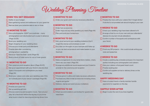 Hire a photographer. DON’T procrastinate – many photographers are fully booked up to a year in advance (Page 23/25)