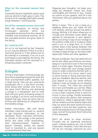 Giving a a a a a a meaningful moving eulogy can be a a a a a a a a nerve-wracking situation for even the most accomplished public speaker but it need not be How can you summarize somebody’s life in in in a a a a a few short minutes while being both somber and and funny at the the same time? Writing and and delivering a a a a a a a eulogy is a a a a a a a therapeutic tool to to to help deal with your grief and and being chosen to to to give a a a a a a a a a eulogy is an an an honor and and should be be treated that way Here are some tips for writing and and delivering an an an eloquent and and memorable eulogy Gather information Talk with family members close friends and co- workers to get important important information information on on on the deceased Some important important information information to include in in in the the the eulogy is the the the person’s family and other close relationships their education/career hobbies or special special interests places the the person lived or travelled to and any special special accomplishments they had Organize your your thoughts Jot down your your ideas by whatever means are most comfortable and and familiar to you you Create an an an outline of your speech and and fill in in in the the the information that you you gathered about the the the person Write it it down This is is not a a a a a a toast at a a a a a a wedding where you you can make off the cuff remarks and you you you should not adlib a a a a a a a a eulogy Writing it it all all down allows you you you to include and remember every detail you you you wanted to to incorporate in in in in your your speech When you you you bring a a a a a a copy of your your eulogy to to to the podium make sure it it is easy to to read print it it it out in in a a a a a a a a a large font or if hand- written leave a a a a a a a few spaces between the lines Keep in in in in in mind your time constraints it’s best to keep things on on the the the short side especially if there are other speakers Review and Revise Your first draft will not be the the last When you you think you you are done sleep on on it it it and look it it it over in in in in the the morning when it it it is fresh again Practice Practice Practice Practice Practice Practice Practice Practice Practice Read over your eulogy several times in in order to become familiar with it it it Practice in in front of a a a a a a a a mirror read it it it over to some friends or or family and have them give you you you feedback Become familiar with with your speech so you you you you can recite without making it it it look as though you’re reading from a a a a a a a script The more more you you you practice the the more more comfortable you you will be be Make them laugh but be be respectful A funeral is is not a a a a roast however there is is room for humor in your eulogy Fondly remember a a a a a a a story about the the person that everyone can relate to to Keep it appropriate there there will be children and the the the the elderly there there who may not share the the the the same sense of humor Laughter is truly the the best medicine and some well-placed humor will will help people cope and will will bring back fond memories of the deceased Don’t be afraid to show emotion emotion Funerals are an extremely emotional event nobody expects you you you not to shed a a a few tears However if you you you you feel that you you you you will be too strongly overcome by your Page 18 - CRABIEL HOME FOR FUNERALS CRABIEL HOME FOR FUNERALS - Page