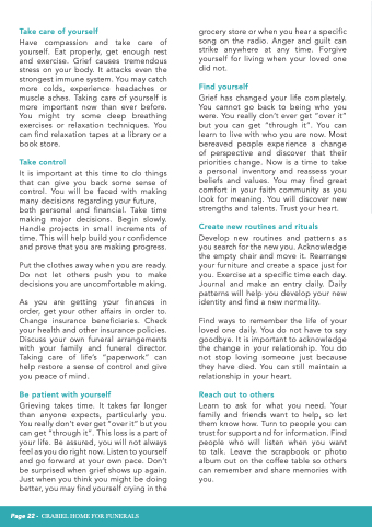 Develop new new routines and patterns as you you search for the the new new you you Acknowledge the the empty chair and and move it it Rearrange your furniture and and create a a a a a a a a a a a a space just for you you Exercise at at a a a a a a a a a a a a a a specific time each day Journal and make an an entry daily Daily patterns will help you you develop your new new identity and find a a a a new normality Find ways to to remember the life of your loved one daily You do not have to to to say goodbye It is important to to acknowledge the change in in your relationship You do not stop loving someone just because they have died You can still maintain a a a a a a a a relationship in your heart Reach out to others Learn to to ask for what you need Your family and friends want to to to help so let them know how Turn to to people you can trust for for for support and for for for information Find people who will listen when you want to to talk Leave the the the scrapbook or photo album out on the the the coffee table so others can remember and share memories with you Page 22 - CRABIEL HOME FOR FUNERALS CRABIEL HOME FOR FUNERALS - Page