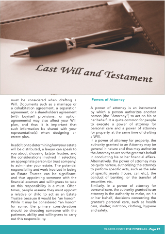 to to to act on on the the grantor’s behalf in in in conducting his or or or or her financial affairs Alternatively the the power of attorney attorney may be quite narrow authorizing the the the attorney attorney to to perform specific specific acts such as as the the the sale of of of specific specific assets (house car etc ) the the the conduct of of of banking or the the transfer of of of securities etc Similarly in a a a a a a a a power of attorney for personal care the the authority authority granted to to to to an an attorney is is is the the the authority authority to to to make on on on on his or or or or her behalf decisions concerning the the grantor’s personal care care such as health care care shelter nutrition clothing hygiene and safety Page - CRABIEL HOME FOR FUNERALS CRABIEL HOME FOR FUNERALS - Page 27