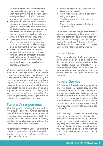 A formal formal or or or or or informal ceremony or or or or or ritual prior to to burial a a a a a a a a a funeral service often provides a a a a a a a sense of of closure to to family and friends Although your faith or culture may may dictate some elements of a a a a a a a a funeral service service you may may want to personalize other elements of the the service service service At a a a a a a a funeral service service a a a a a a a casket casket or urn is present though you may choose to have the casket casket open or closed Held the the the night before or or or immediately prior to the the the funeral service the the the visitation - - also called a a a a a a a a a a a a a wake or or or a a a a a a a a a a a a a viewing - - provides a a a a a a a a a a a a a way for friends and and acquaintances to to pay respects and and offer condolences to to your family As with the funeral service you you you may want want to decide if you you you want want an an an open or closed casket should one be present Page - CRABIEL HOME FOR FUNERALS CRABIEL HOME FOR FUNERALS - Page 9