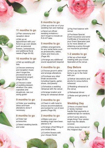 ❑ Check in with hotel to ensure accommodations are booked for out of town guests (Page 29)