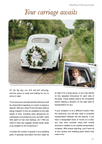 Try to ensure you actually see the vehicle you will be using before agreeing on a price or paying a deposit. Will your dress fit into the back without being creased? Is the car available for the right length of time, including extra allowances for unforeseen circumstances such as traffic, extra time spent on hair and makeup, etc.? Will you need to have any luggage stowed away ready to go straight on the honeymoon?