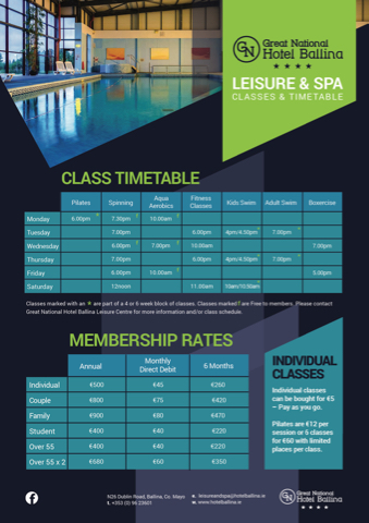 Great National Hotel Ballina | Leisure & Spa Timetable