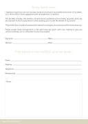 I I wanted to spare you as as much anxiety doubt and confusion as as possible at at the time of my death so so in in this booklet I I have suggested some arrangements in in advance This booklet includes vital statistics funeral funeral service service guidelines and cemetery requests which are all important to to to the the funeral funeral director while assisting you to to to plan the the details of my service service The booklet also includes more personal material for eulogies obituaries and other remembrances Please accept these arrangements in in the the the the spirit they are are given with love hoping to to give give you you comfort and help you to remember the the the the time we shared Signature: Witness: