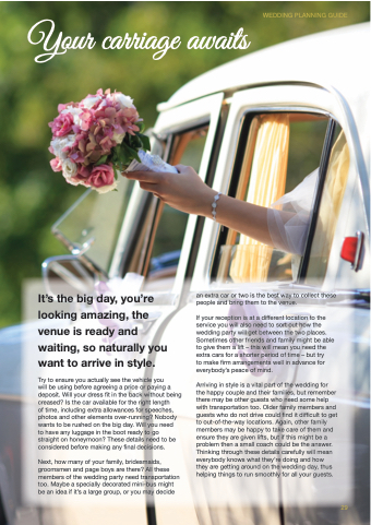 If your reception is at a different location to the service you will also need to sort out how the wedding party will get between the two places. Sometimes other friends and family might be able to give them a lift – this will mean you need the extra cars for a shorter period of time – but try