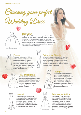 hips with a skirt which gently flows outwards to become full at the hem. This design is perfect for making brides look thinner and for those who have a pear-shaped figure and/or a short waist. Those with a full hourglass figure may be best avoiding a Princess style.