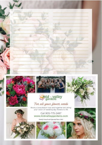 For all your flower needs Book a consultation now and together let’s bring your vision of wedding day flowers to life Call 905-775-2487 www.midvalleygardens.com Family Owned and Operated Since 1952