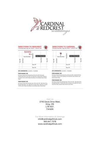 CARDINAL & REDCREST weddings Visit Us 2740 Davis Drive West, King, ON L7B 0G7, Canada For More Information & Viewings info@cardinalgolfclub.com 905.841.7378 www.cardinalgolfclub.com