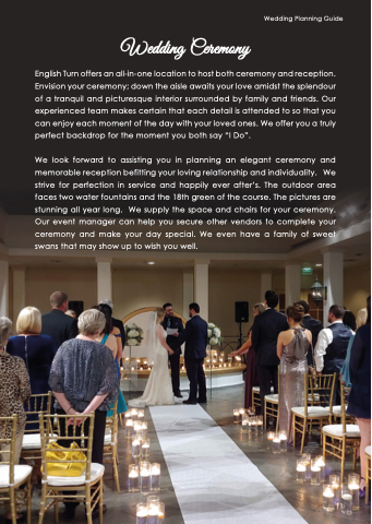 We look forward to assisting you in planning an elegant ceremony and memorable reception befitting your loving relationship and individuality. We strive for perfection in service and happily ever after’s. The outdoor area faces two water fountains and the 18th green of the course. The pictures are stunning all year long. We supply the space and chairs for your ceremony. Our event manager can help you secure other vendors to complete your ceremony and make your day special. We even have a family of sweet swans that may show up to wish you well.
