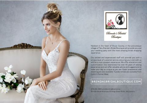 Nestled in the heart of Bruce County, in the picturesque village of Tara, Brenda’s Bridal Boutique will provide you and your wedding party with the most amazing bridal shopping experience.