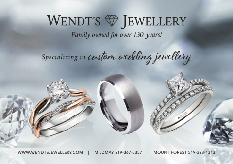 WENDT’S JEWELLERY Family owned for over 130 years! Specializing in custom wedding jeweery WWW.WENDTSJEWELLERY.COM | MILDMAY 519-367-5357 | MOUNT FOREST 519-323-1313