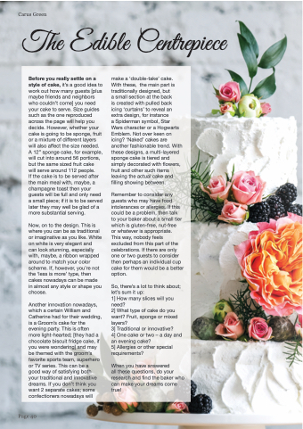 Before you really settle on a style of cake, it’s a good idea to work out how many guests [plus maybe friends and neighbors who couldn’t come] you need your cake to serve. Size guides such as the one reproduced across the page will help you decide. However, whether your cake is going to be sponge, fruit or a mixture of different layers will also affect the size needed. A 12” sponge cake, for example, will cut into around 56 portions, but the same sized fruit cake will serve around 112 people.