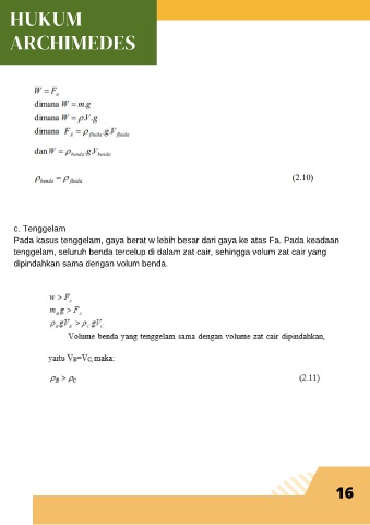 HUKUM ARCHIMEDES c. Tenggelam Pada kasus tenggelam, gaya berat w lebih besar dari gaya ke atas Fa. Pada keadaan tenggelam, seluruh benda tercelup di dalam zat cair, sehingga volum zat cair yang dipindahkan sama dengan volum benda. 2 4 2 16