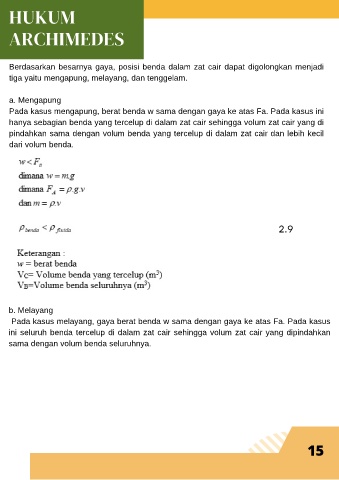 Pada kasus melayang, gaya berat benda w sama dengan gaya ke atas Fa. Pada kasus