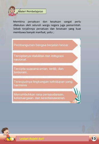 Materi Pembelajaran Membina persatuan dan kesatuan sangat perlu dilakukan oleh seluruh warga negara juga pemerintah. Sebab terjalinnya persatuan dan kesatuan yang kuat membawa banyak manfaat, yaitu ; Lestari Rejeki Asri Nama Pembuat, Sekolah 13