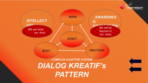 MIND AWARENES INTELLECT S/ UAL CONSCIOUSN We will be We are what ESS beyond of we think our mind SPIRIT BODY EMOTION COMPLEX ADAPTIVE SYSTEM KECERDASAN DIALOG KREATIF’s HATI CAS PATTERN 3 2