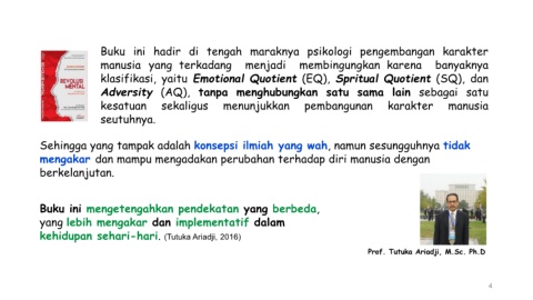 Buku ini hadir di tengah maraknya psikologi pengembangan karakter