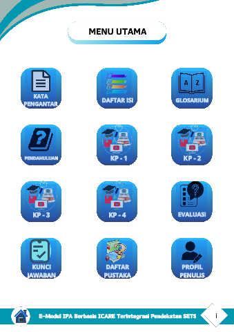 MENU UTAMA KATA DAFTAR ISI PENGANTAR GLOSARIUM PENDAHULUAN KP - 1 KP - 2 KP - 3 KP - 4 EVALUASI KUNCI DAFTAR PROFIL JAWABAN PUSTAKA PENULIS E-Modul IPA Berbasis ICARE Terintegrasi Pendekatan SETS i