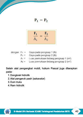 Selain alat pengangkat mobil, hukum Pascal juga diterapkan pada: 1. Dongkrak hidrolik 2. Alat pengeruk pasir (eskavator) 3. Dum truks 4. Rem hidrolik E-Modul IPA Berbasis ICARE Terintegrasi Pendekatan SETS 40