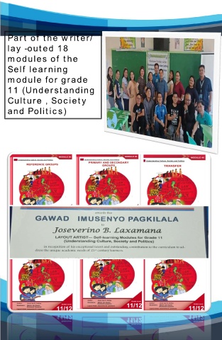 Part of the writer/ lay -outed 18 modules of the Self learning module for grade 11 (Understanding Culture , Society and Politics)