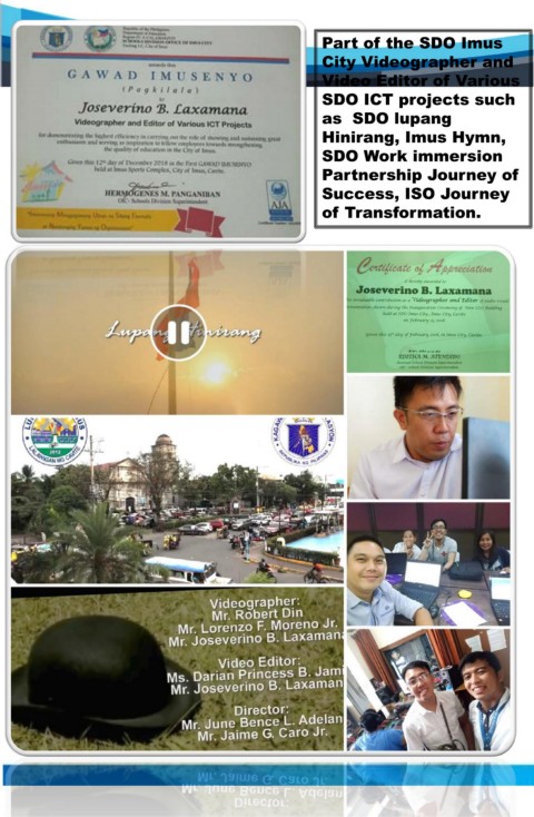 Part of the SDO Imus City Videographer and Video Editor of Various SDO ICT projects such as SDO lupang Hinirang, Imus Hymn, SDO Work immersion Partnership Journey of Success, ISO Journey of Transformation.