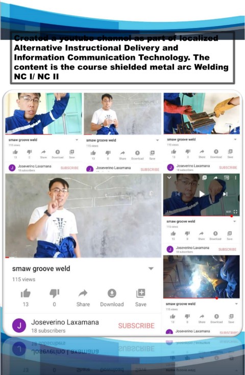 Created a youtube channel as part of localized Alternative Instructional Delivery and Information Communication Technology. The content is the course shielded metal arc Welding NC I/ NC II