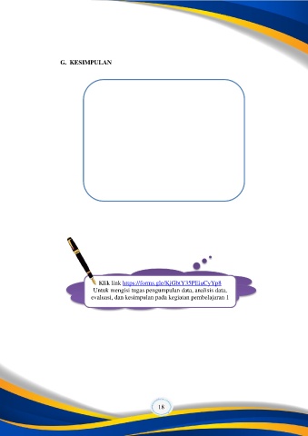 G. KESIMPULAN Klik link https://forms.gle/KjGbtY35PEiuCyYp8 Untuk mengisi tugas pengumpulan data, analisis data, evaluasi, dan kesimpulan pada kegiatan pembelajaran 1 18