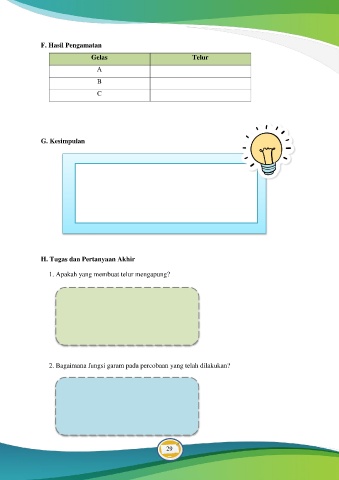 F. Hasil Pengamatan Gelas Telur A B C G. Kesimpulan H. Tugas dan Pertanyaan Akhir 1. Apakah yang membuat telur mengapung? 2. Bagaimana fungsi garam pada percobaan yang telah dilakukan? 29