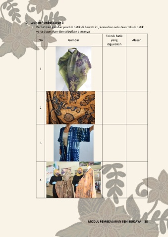 D. Latihan Pembelajaran 3 Perhatikan gambar produk batik di bawah ini, kemudian sebutkan teknik batik yang digunakan dan sebutkan alasanya Teknik Batik No Gambar yang Alasan digunakan 1 2 3 4 MODUL PEMBEAJARAN SENI BUDAYA | 28