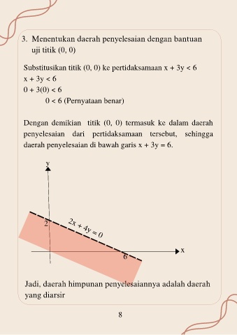 Substitusikan titik (0, 0) ke pertidaksamaan x + 3y < 6