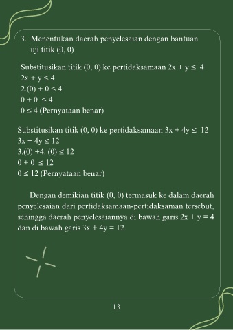 Substitusikan titik (0, 0) ke pertidaksamaan 3x + 4y ≤  12
