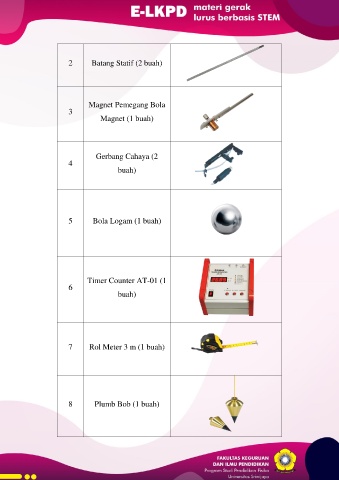 2 Batang Statif (2 buah) Magnet Pemegang Bola 3 Magnet (1 buah) Gerbang Cahaya (2 4 buah) 5 Bola Logam (1 buah) Timer Counter AT-01 (1 6 buah) 7 Rol Meter 3 m (1 buah) 8 Plumb Bob (1 buah)