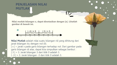 Nilai mutlak bilangan x, dapat dinotasikan dengan |x|. Lihatlah