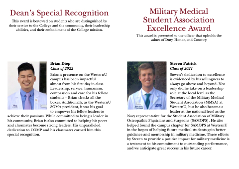 Navy representative for the Student Association of Military Osteopathic Physicians and Surgeons (SAMOPS). He also helped found the campus chapter for SAMOPS at WesternU in the hopes of helping future medical students gain better guidance and mentorship in military medicine. These efforts by Steven to provide a positive impact for military medicine is a testament to his commitment to outstanding performance, and we anticipate great success in his future career.