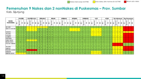 Nakes mencukupi std PMK Ada nakes, blm memenuhi std PMK Belum ada nakes Pemenuhan 9 Nakes dan 2 nonNakes di Puskesmas – Prov. Sumbar Kab. Sijunjung 136