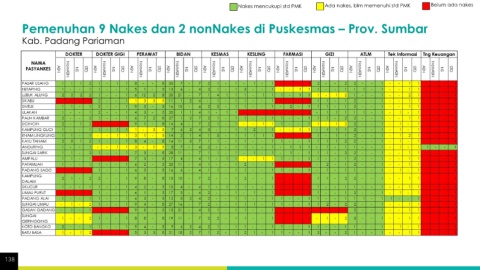 Nakes mencukupi std PMK Ada nakes, blm memenuhi std PMK Belum ada nakes Pemenuhan 9 Nakes dan 2 nonNakes di Puskesmas – Prov. Sumbar Kab. Padang Pariaman 138