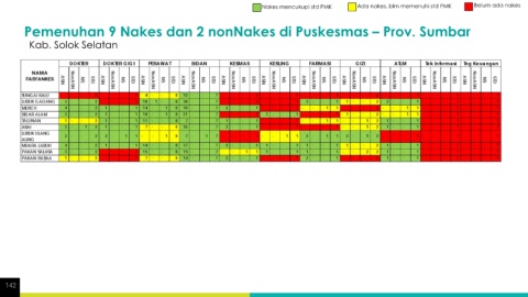 Nakes mencukupi std PMK Ada nakes, blm memenuhi std PMK Belum ada nakes Pemenuhan 9 Nakes dan 2 nonNakes di Puskesmas – Prov. Sumbar Kab. Solok Selatan 142