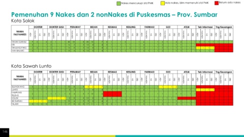 Nakes mencukupi std PMK Ada nakes, blm memenuhi std PMK Belum ada nakes Pemenuhan 9 Nakes dan 2 nonNakes di Puskesmas – Prov. Sumbar Kota Solok Kota Sawah Lunto 146