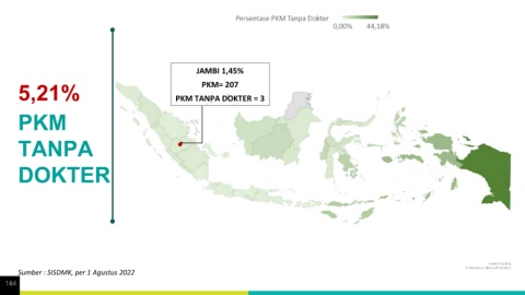 JAMBI 1,45% 5,21% PKM TANPA DOKTER = 3 PKM= 207 PKM TANPA DOKTER Sumber : SISDMK, per 1 Agustus 2022 184