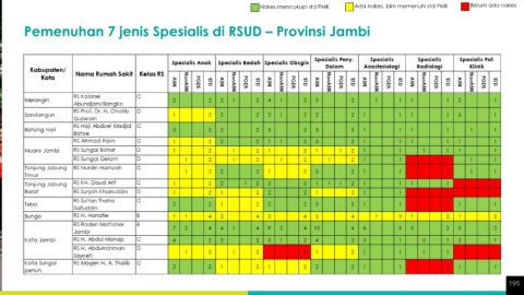 Nakes mencukupi std PMK Ada nakes, blm memenuhi std PMK Belum ada nakes Pemenuhan 7 jenis Spesialis di RSUD – Provinsi Jambi 195