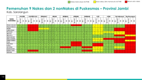 Nakes mencukupi std PMK Ada nakes, blm memenuhi std PMK Belum ada nakes Pemenuhan 9 Nakes dan 2 nonNakes di Puskesmas – Provinsi Jambi Kab. Sarolangun 198