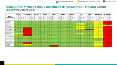 Nakes mencukupi std PMK Ada nakes, blm memenuhi std PMK Belum ada nakes Pemenuhan 9 Nakes dan 2 nonNakes di Puskesmas – Provinsi Jambi Kab. Tanjung Jabung Barat 202