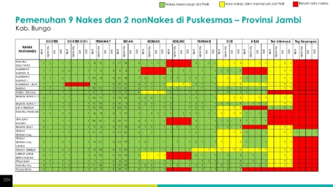 Nakes mencukupi std PMK Ada nakes, blm memenuhi std PMK Belum ada nakes Pemenuhan 9 Nakes dan 2 nonNakes di Puskesmas – Provinsi Jambi Kab. Bungo 204