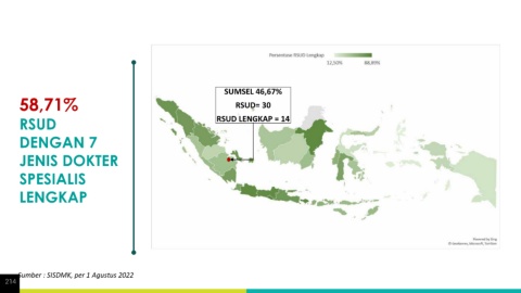 SUMSEL 46,67% 58,71% RSUD= 30 RSUD RSUD LENGKAP = 14 DENGAN 7 JENIS DOKTER SPESIALIS LENGKAP Sumber : SISDMK, per 1 Agustus 2022 214