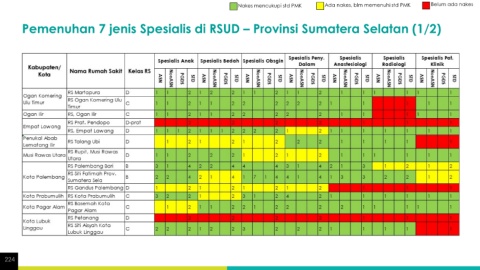 Nakes mencukupi std PMK Ada nakes, blm memenuhi std PMK Belum ada nakes Pemenuhan 7 jenis Spesialis di RSUD – Provinsi Sumatera Selatan (1/2) 224