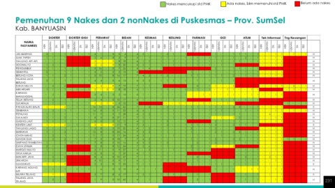 Nakes mencukupi std PMK Ada nakes, blm memenuhi std PMK Belum ada nakes Pemenuhan 9 Nakes dan 2 nonNakes di Puskesmas – Prov. SumSel Pemenuhan 9 Nakes dan 2 nonNakes di Puskesmas – Prov. SumSel Kab. MUSI BANYUASIN Kab. BANYUASIN 231