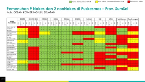 Nakes mencukupi std PMK Ada nakes, blm memenuhi std PMK Belum ada nakes Pemenuhan 9 Nakes dan 2 nonNakes di Puskesmas – Prov. SumSel Kab. OGAN KOMERING ULU SELATAN 232