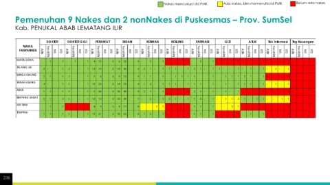 Nakes mencukupi std PMK Ada nakes, blm memenuhi std PMK Belum ada nakes Pemenuhan 9 Nakes dan 2 nonNakes di Puskesmas – Prov. SumSel Kab. PENUKAL ABAB LEMATANG ILIR 236